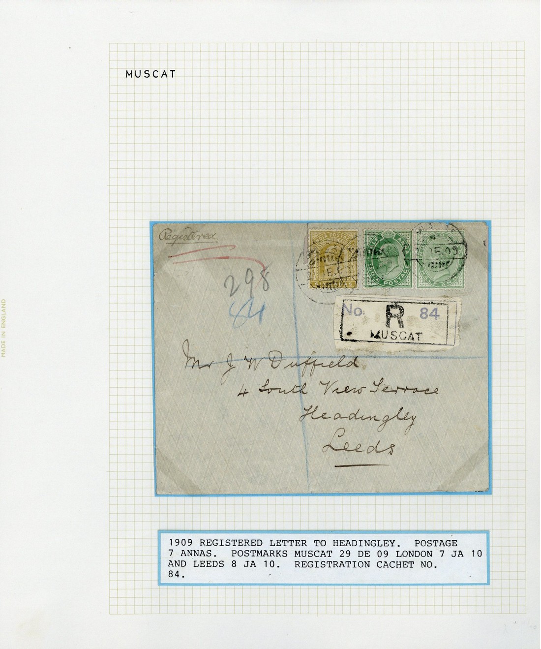 1909 envelope registered to England, bearing ½a. (2) and 6a. all cancelled by C17 "bridge" type c.d.s. and with handstamped registration label below, and 1910 printed envelope registered to Bombay, bearing ½a. (6) cancelled by C17 "bridge" type c.d.s. and with handstamped registration label at foot