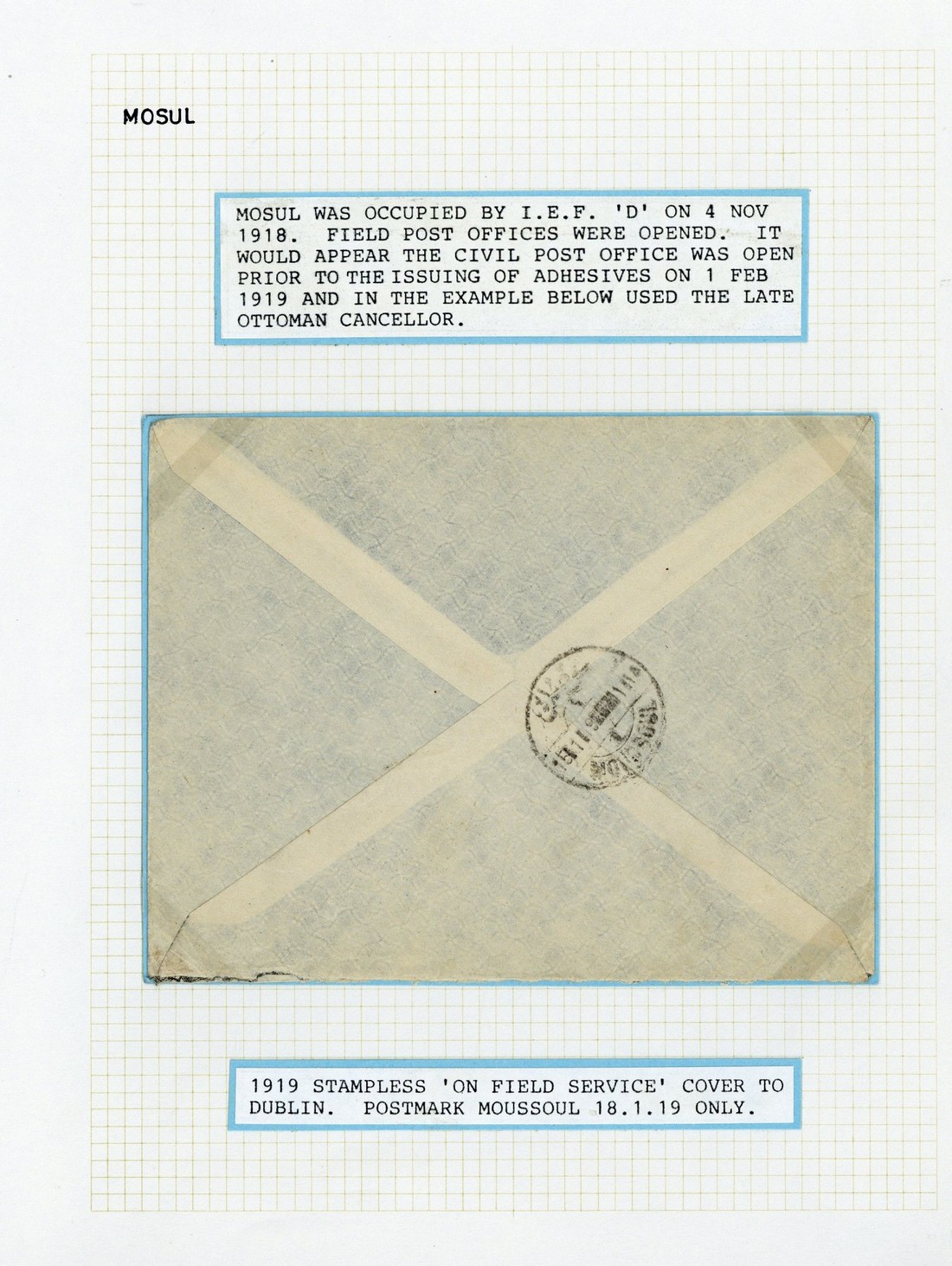 1919 "On Field Service" envelopes to Ireland (3) showing, on reverse, use of the late Ottoman "moussel" c.d.s., large 35mm. double-ring datestamp and 32mm. double-ring datestamp, 1925 envelope from England to Mosul, marked "Overland Haifa Baghdad", one of the very few known covers travelling east by overland route, and 1930 cover to England by airmail franked at 6a.
