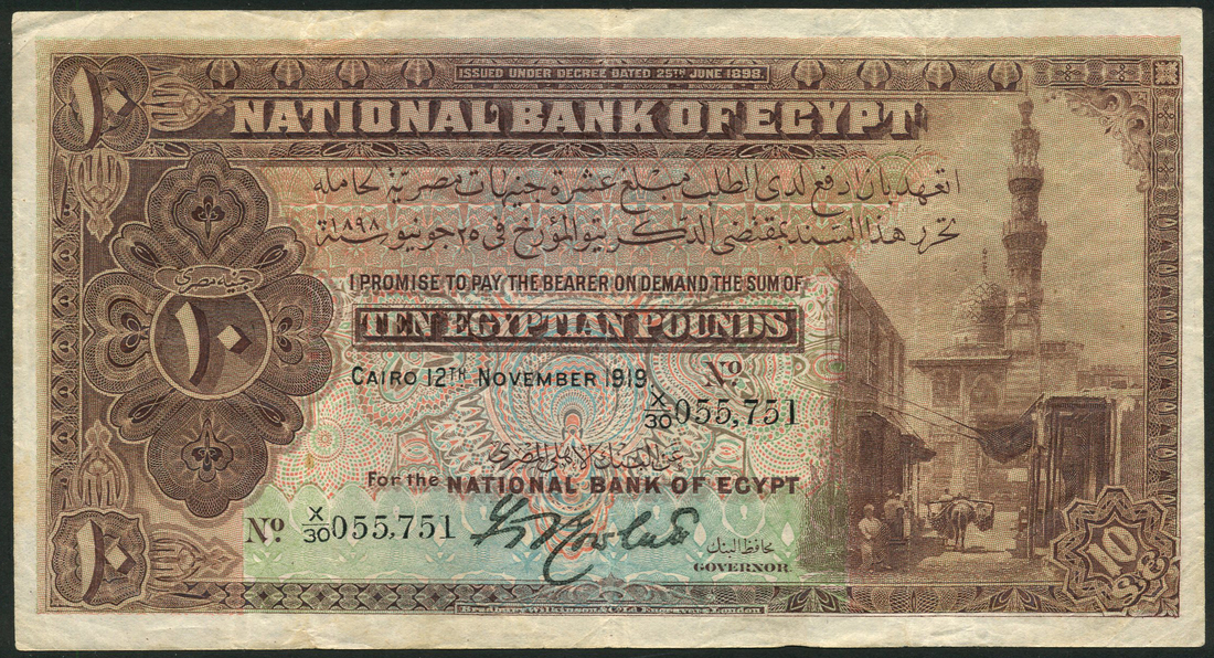 National Bank of Egypt, £10, 12 November 1919, serial number X/30 055751, purple-brown and multicoloured, the Mosque of Qayetbay and street scene at right, value at left, Rowlatt signature, reverse brown