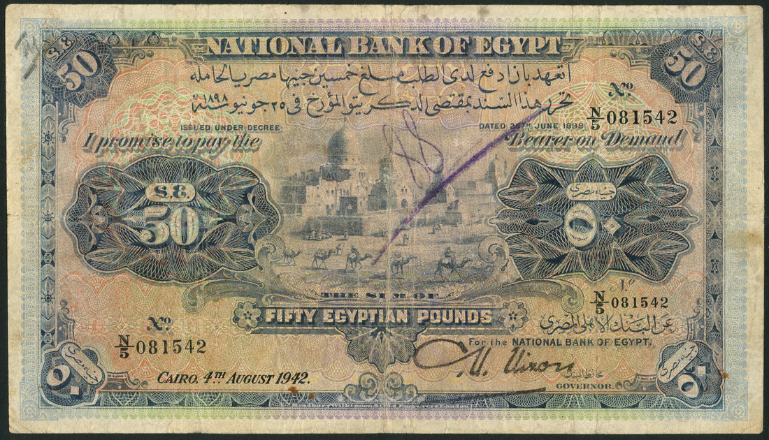 (x) National Bank of Egypt, £50, 4 August 1942, serial number N/5081542, multicolour, camel train and Mameluke Tomb at centre, Nixon signature, reverse, multicolour, value at left and right
