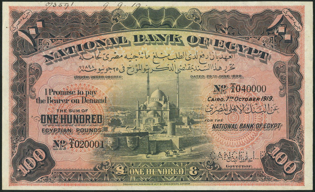 (†) National Bank of Egypt, printer's archival specimen 100 Pounds, 7 October 1919, serial number run T/1 020001-T/1 04000, no signature, purple and multicoloured, the citadel and Mosque of Mohammed Ali at centre, value in each corner, reverse value in western and Arabic numerals in guilloches at left and right set in ornate floral pattern, perforated CANCELLED