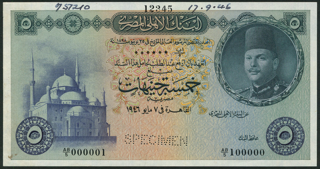(†) National Bank of Egypt, printer's archival specimen 5 Pounds, 1946, serial number run AB/5 000001 to AB/5 100000, no signature, blue-green and multicoloured, portrait of King Farouk at upper right, Citadel of Cairo at left, reverse olive-green, the god Nilos and his thirteen sons, perforated SPECIMEN