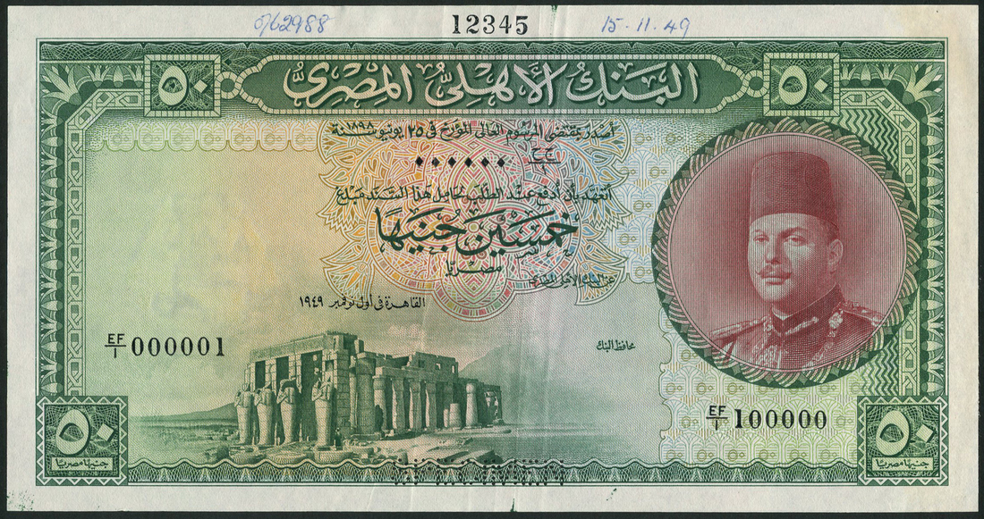 (†) National Bank of Egypt, printer's archival specimen 50 Pounds, 1949, serial number run EF/1 000001 to EF/1 100000, no signature, green, brown and multicoloured, portrait of King Farouk at right, the Ramesseum Temple at Luxor at lower left, reverse the Mameluke cemetery and the Mosque of Muhammad Ali, perforated SPECIMEN
