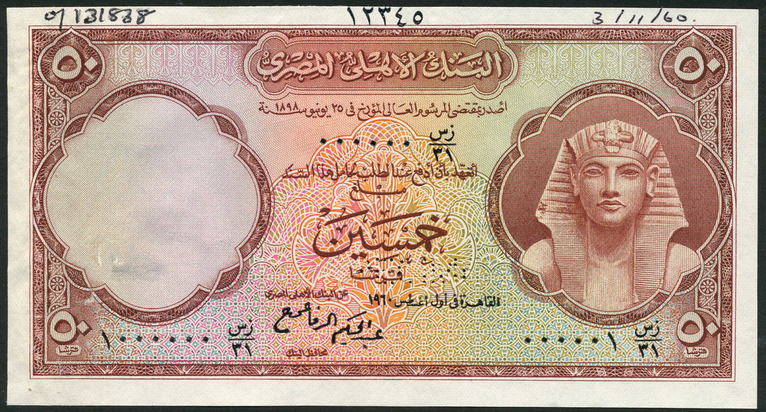 (†) National Bank of Egypt, printer's archival specimen 50 Piastres, 1960, serial number run in Arabic script 000001 to 1000000, Arabic signature; also specimen proof 50 Piastres ND (1960), no serial numbers, no signature, both brown on multicoloured underprint, Tutankhamen at right, reverse the building of Trajan at the Temple of Philae, perforated SPECIMEN
