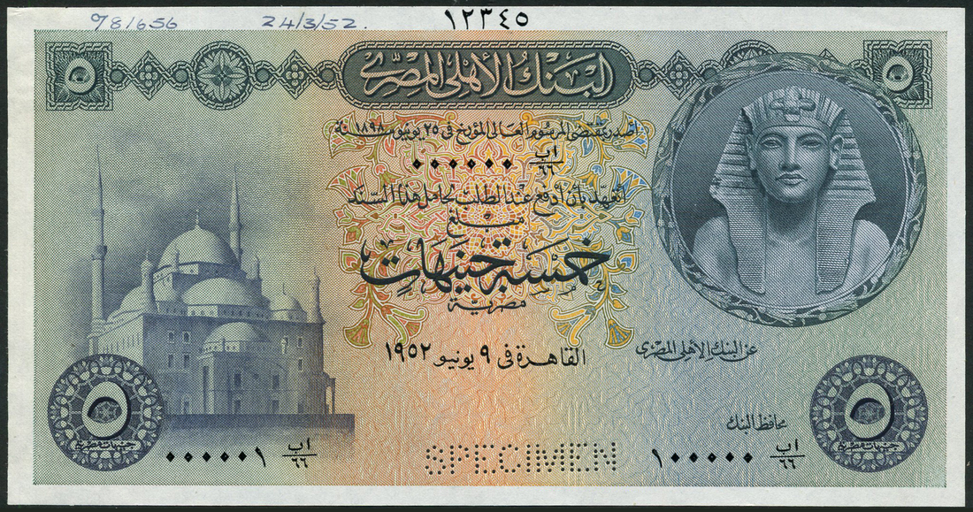 (†) National Bank of Egypt, printer's archival specimen 5 Pounds, 1952, serial number run in Arabic script 000001 to 1000000, no signature, blue-green on orange and multicoloured underprint, Tutankhamen at upper right, the Mosque of Mohammed Ali at left, reverse deep olive-green, the god Nilos and his thirteen sons, perforated SPECIMEN