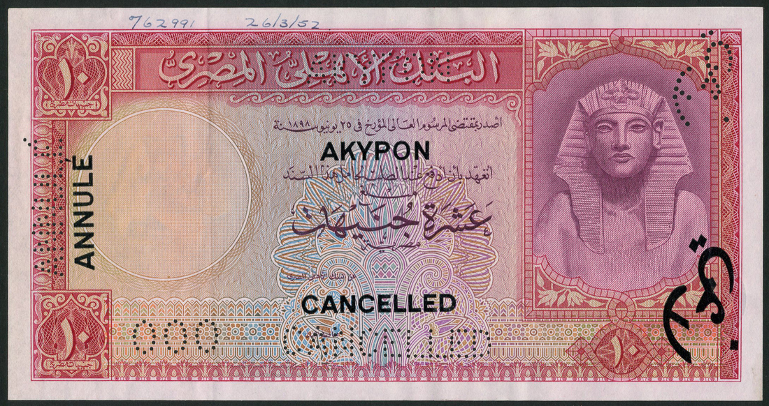 (†) National Bank of Egypt, printer's archival specimen 10 Pounds, ND (ca1952), no serial numbers, no signature, red and multicoloured, Tutankhamen at right, reverse the ruins at Karnak, overprinted in black ANNULE, AKYPON, CANCELLED and in Arabic, on obverse and reverse, perforated 000 CANCELLED