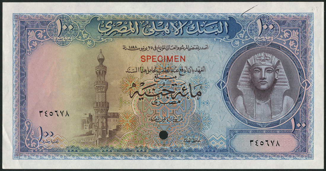(†) National Bank of Egypt, specimen colour trial 100 Pounds, ND (ca 1952), serial number 345678, no signature, blue, slate and multicoloured, Tutankhamen at right, minaret at left, reverse olive-green, the Mosque of Qadi Yahya Zein al-Din, overprinted SPECIMEN in red on obverse and reverse, one punch hole