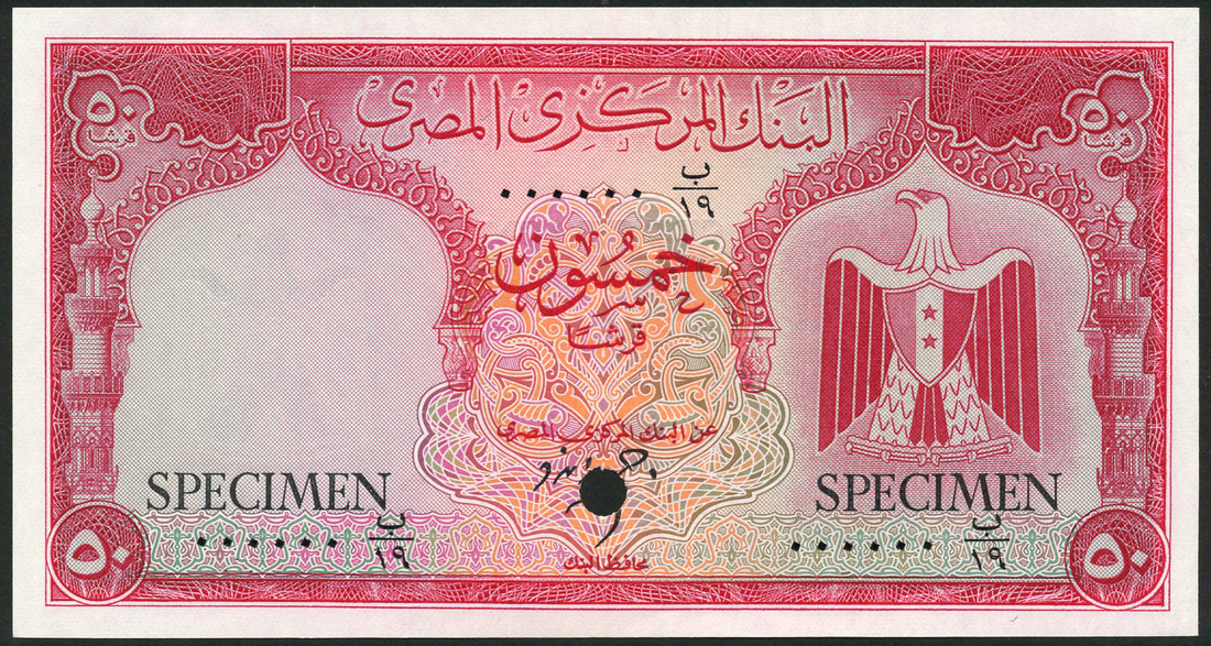 (†) Central Bank of Egypt, colour trial 25 piastres, ND (ca 1961), brown and pale blue and colour trial 50 piastres, ND (ca 1961), red and multicoloured, Zendo signature, both arms of the U.A.R. at left