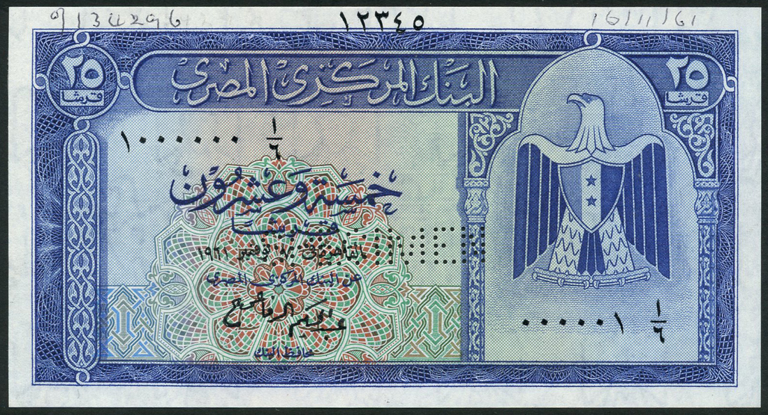 (†) Central Bank of Egypt, printer's archival specimen 25 Piastres (3), 1961, serial number runs 1/6 000001 to 1/6 1000000; 1/7 000001 to 1/7 1000000; and 1/8 000001 to 1/8 1000000, blue on multicoloured underprint, coat of arms of the U. A. R. at right set in ornate columns, value at top left and right, reverse value set in three guilloches, perforated SPECIMEN, mounting traces, ink date '16. 1. 61' and annotations in top margin, otherwise about uncirculated, very scarce (3)