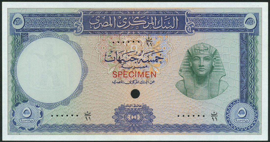(†) Central Bank of Egypt, colour trial 1 pound, ND (ca 1965), purple and colour trial 5 pounds, 1965, blue and green, Zendo signature, both Tutankhamen at right