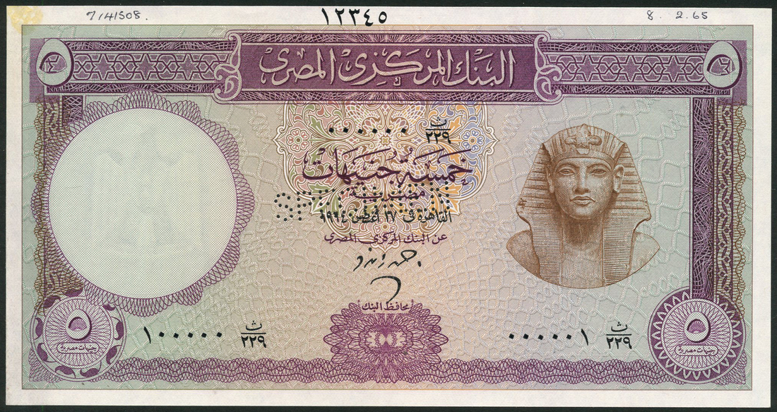 (†) Central Bank of Egypt, printer's archival specimen 5 Pounds, 1964, serial number run TH/229 000001 to TH/229 1000000, lilac and brown on multicoloured underprint, Tutankhamen at right set in ornate columns, value in each corner, reverse value set in guilloche and ornate geometric pattern, perforated SPECIMEN