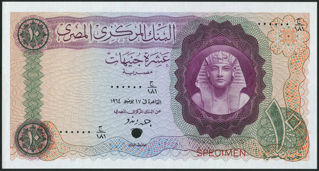 Central Bank of Egypt, colour trial £10, ND (1964), zero serial numbers, multicoloured, Tutankhamen in violet guilloche at right, reverse green and pale orange, hole punched lower centre
