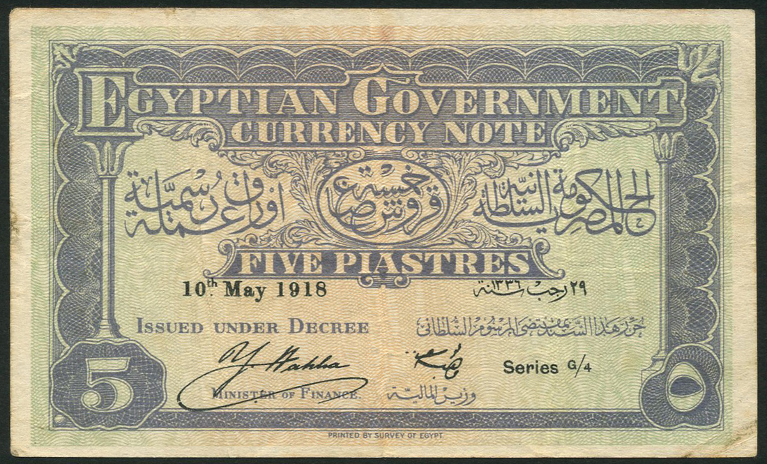 Egyptian Government Currency Note, 5 piastres, 10 May 1918, violet and light green on pale orange underprint, reverse, green, temple on the Nile at centre