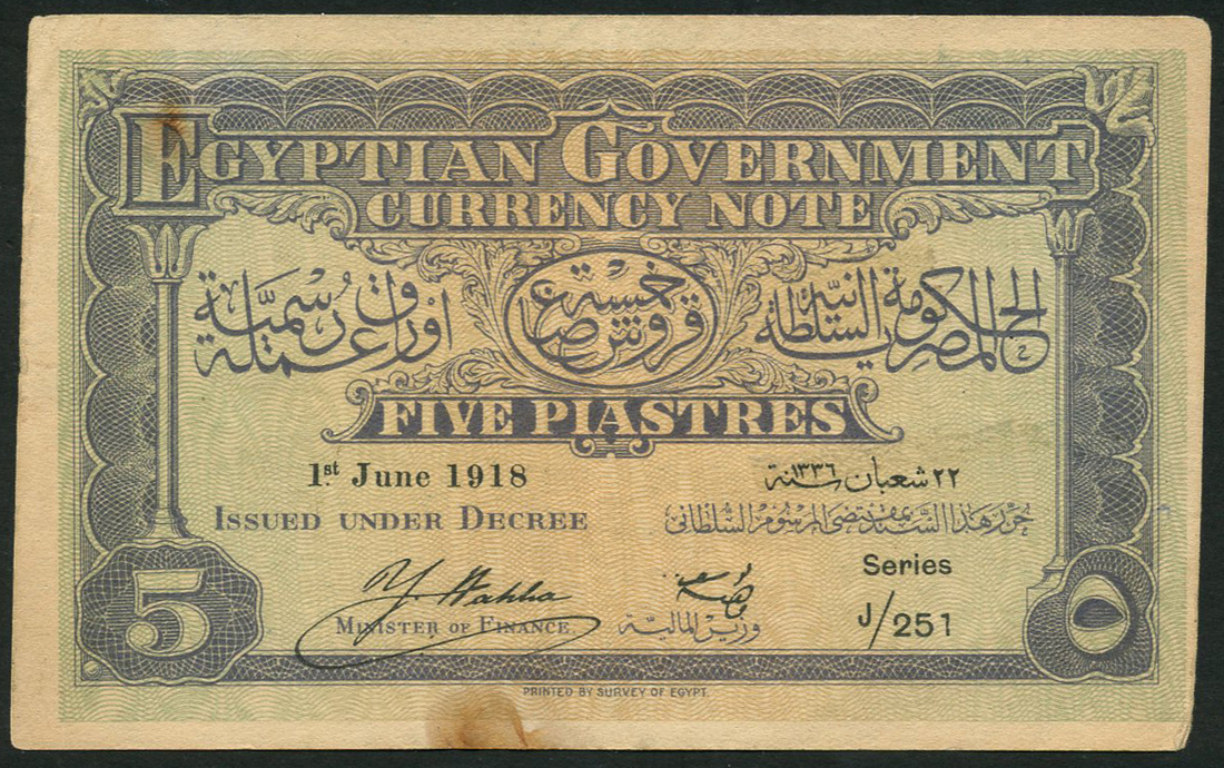 Egyptian Government Currency Note, 5 piastres, 1 June 1918, serial number J/251, violet and pale orange and green, Wahba signature, reverse green, temple on the Nile in oval frame, value at left and right