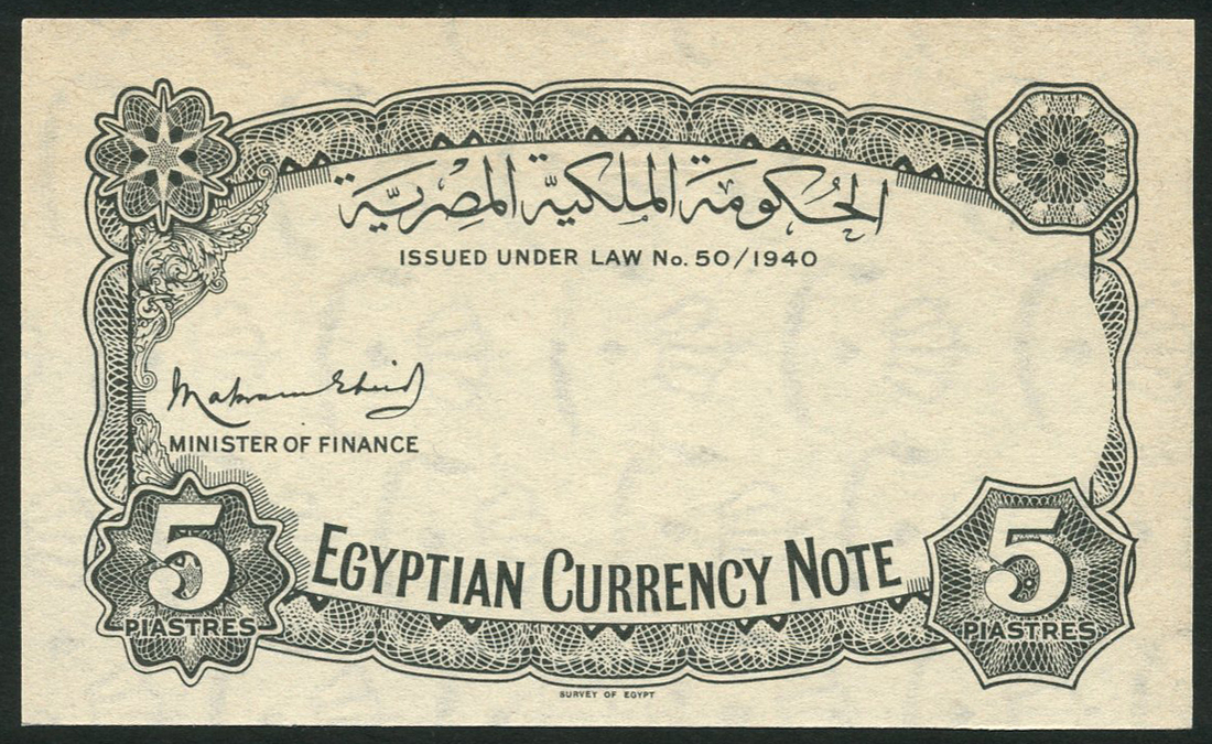 Egyptian Government Currency Note, printer's reverse essay 5 piastres, ND, no serial number, dark grey on pale yellow, M Ebeid signature