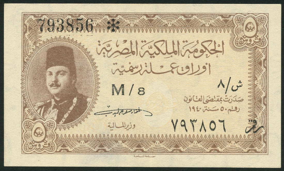 Egyptian Government Currency Note, 5 piastres (2), ND (L50/1940), consecutive serial numbers M/8 793856/7, light brown on pale yellow underprint, portrait King Farouk at left, F Serag Eldin signature
