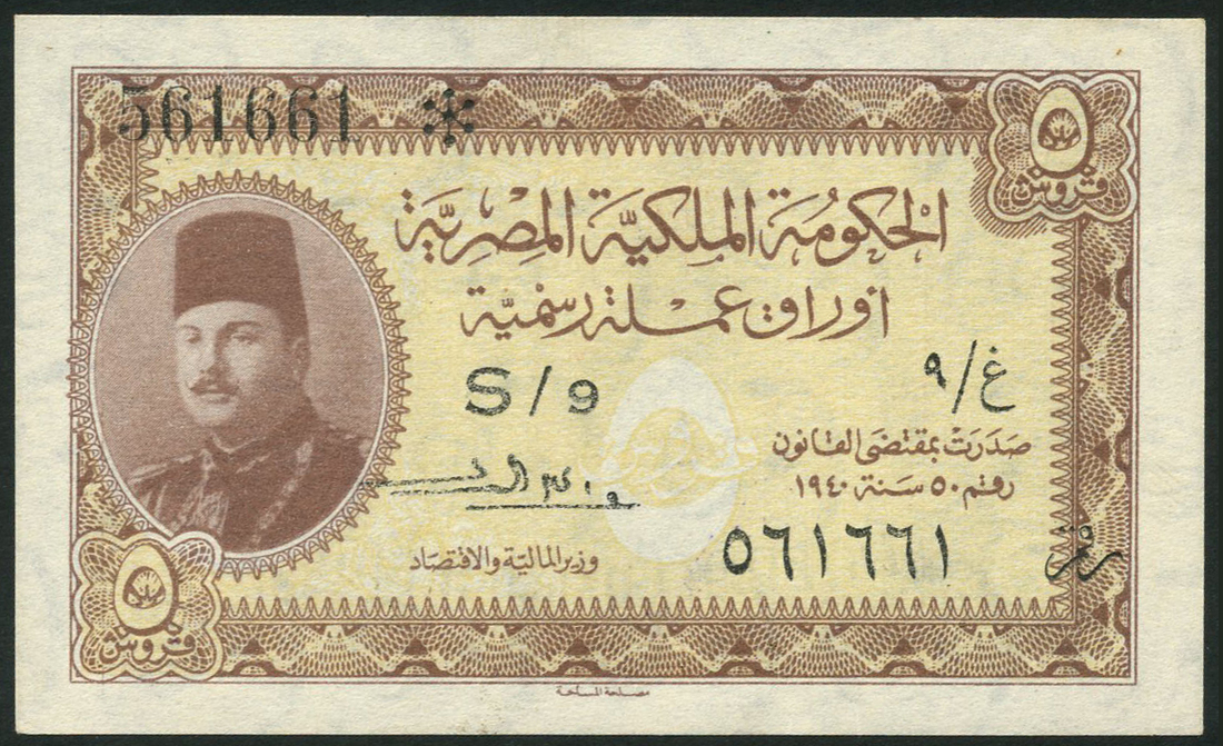 Egyptian Government Currency Note, 5 piastres, ND (L.1940), serial number 561661, brown on pale yellow underprint, portrait King Farouk at left, reverse, blue-grey on light blue underprint