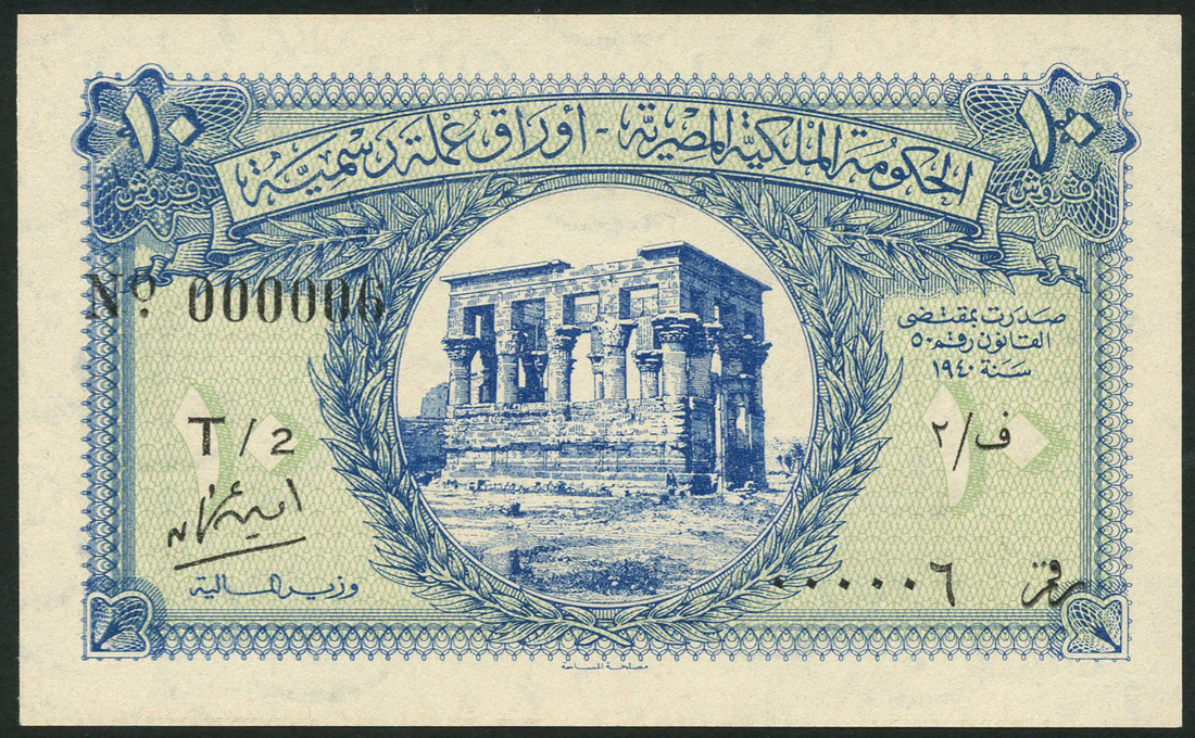 Egyptian Government Currency Note, 10 piastres, ND (L50/1940), serial number T/2 000006, blue and light green, Temple of Philae at centre, A Osman signature, reverse, pink and green