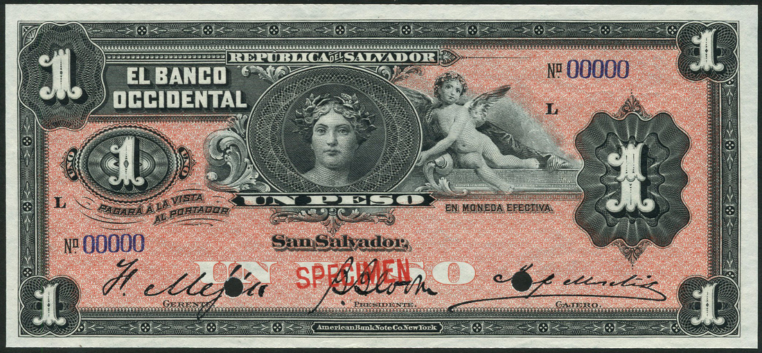 (x) El Banco Oriental, El Salvador, specimen 1 peso, 1899, black, green and yellow, cherub and woman at centre
