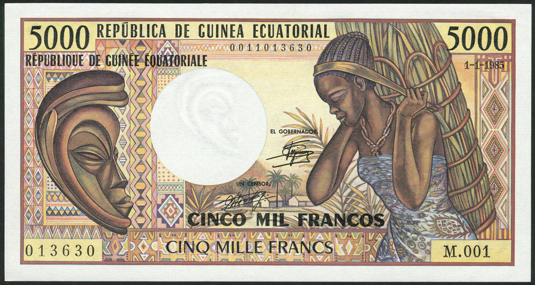 Banque des Etats de l'Afrique Centrale, Guinea, 5000 francs, 1 January 1985, serial number 013630, brown, yellow and multicolour, carved mask at left, woman carrying bundle at right, reverse, multicolour, musical instrument at left, tractor ploughing field centre left, ore lift at right