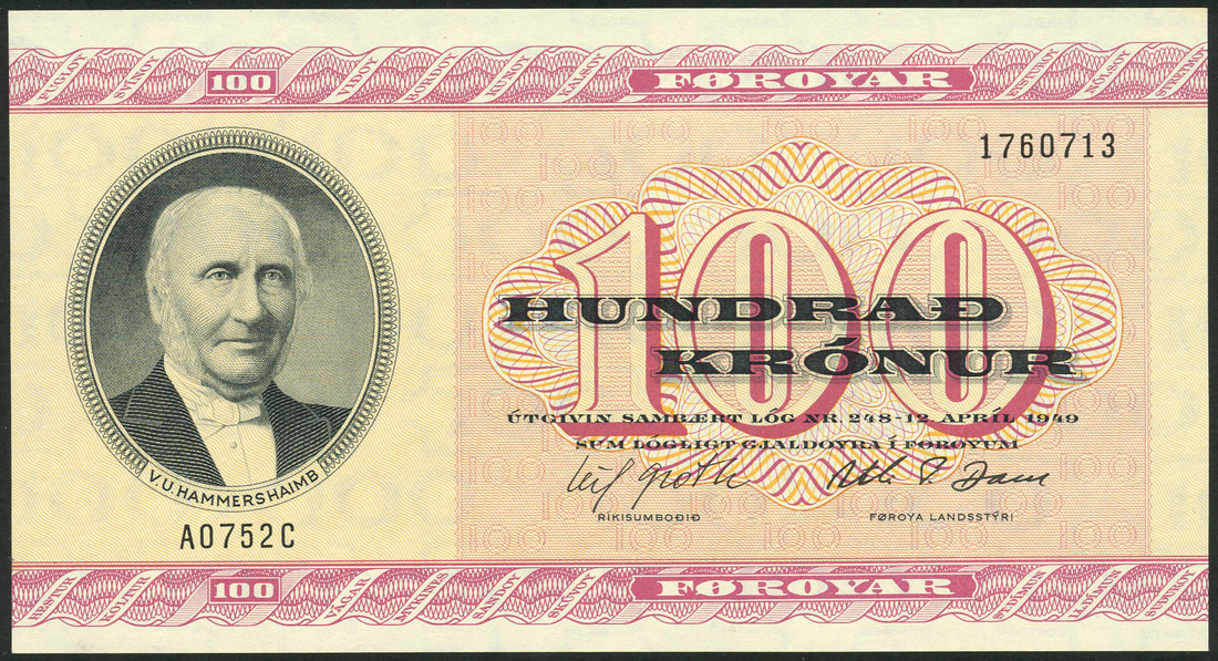 Foroyar, Danish Administration, 100 kronur, 1975, serial number A0752C 1760713, pink and black on yellow and pink underprint, V.U.Hammershaimb at left, value at centre right and upper and lower left