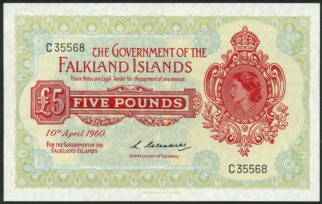 Government of the Falkland Islands, £5, 10 April 1960, serial number C35568, red on light blue, green and yellow underprint, portrait Queen Elizabeth II at right, value in ornate red panel at centre, reverse, elaborate red panel