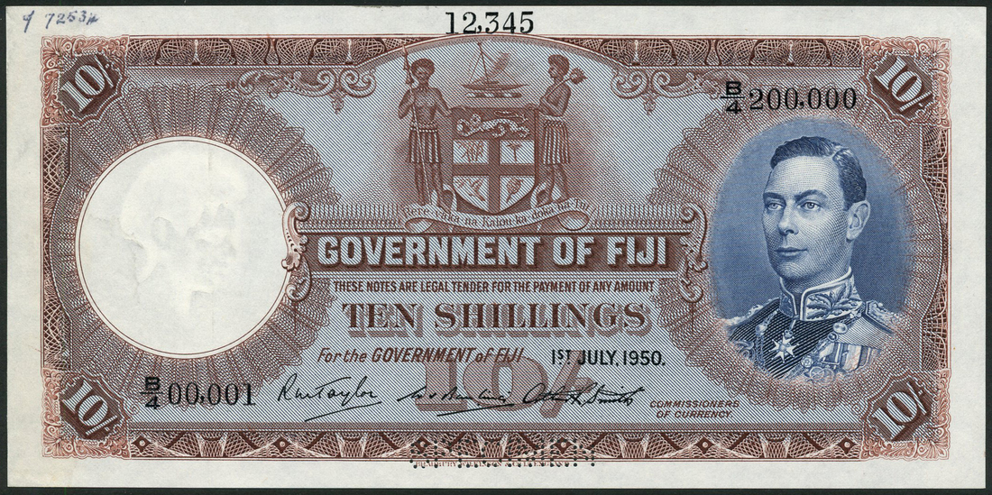 (x) Government of Fiji, specimen 10 shillings, 1 July 1950, serial numbers B/4 0001-B/4 200000, brown and pale blue, George VI at right, arms top centre, signatures of Taylor, Donovan and Smith