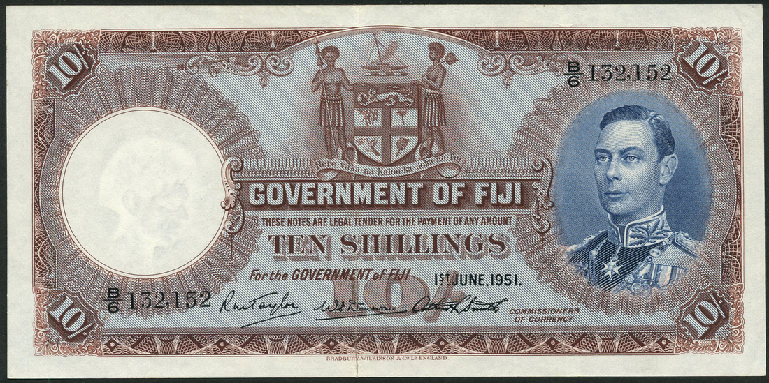 (x) Government of Fiji, 10 shillings, 1 June 1951, serial number B/6 132,152, brown on light blue, King George VI at right, arms top centre, value in each corner and low centre, reverse, multicolour, ornate pattern