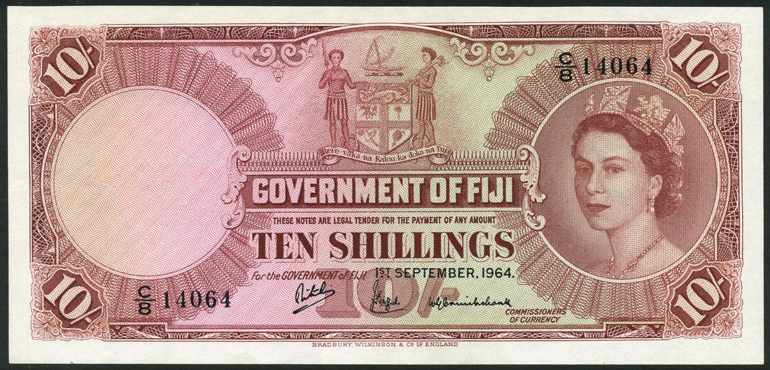 Government of Fiji, 10 shillings, 1 September 1964, serial number C/8 14064, brown on light green, pink and yellow underprint, portrait Queen Elizabeth II at right, arms top centre, reverse, brown, ornately patterned, value at each corner and at centre