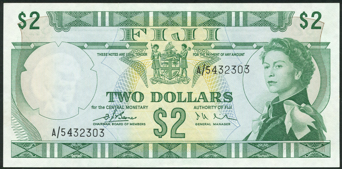 Government of Fiji, $2, ND (1974), serial number A/5 432303, green on pale blue and yellow underprint, portrait Queen Elizabeth II at right, arms top centre, reverse, green, value at each corner and at centre, ornate tablet top and lower margin
