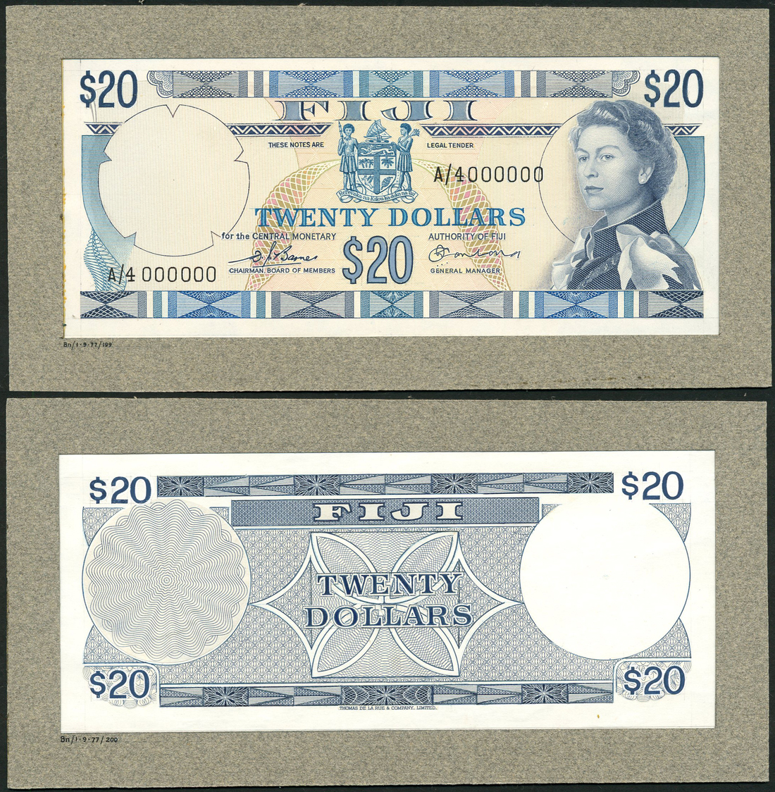 (†) Central Monetary Authority, Fiji, an obverse and reverse composite essay on card for a $20, ND (1977), serial number A/4 000000, Barnes and Earland signatures, dark blue, pale blue and multicoloured, portrait of Queen Elizabeth II by Pietro Annigoni at right, arms at upper centre, reverse geometric pattern