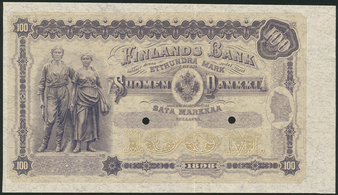(†) Finlands Bank, obverse specimen proof 100 Markkaa, 1898, lilac on pale olive-brown underprint, young farming couple at left, arms at centre, value in each corner, two punch holes, uniface