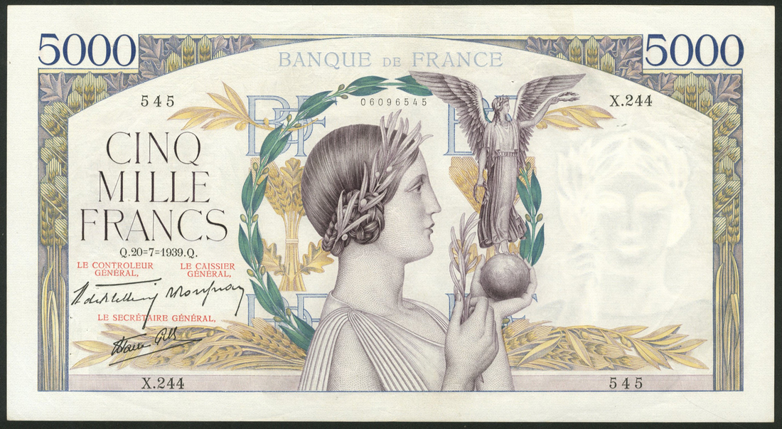 (x) Banque de France, 5000 francs, 20 July 1939, multicolour, woman with Victory statuette and olive branch at centre, ornate border around, value top left and right, plants in background, reverse, similar to obverse but colours more muted