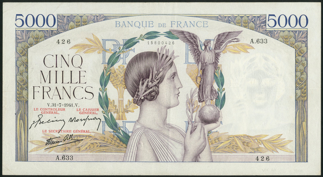 (x) Banque de France, 5000 francs, 31 July 1941, serial number A.633 426, multicolour, woman with Victory statuette and olive branch at centre, ornate border around, value top left and right, plants in background, reverse, similar to obverse but colours more muted