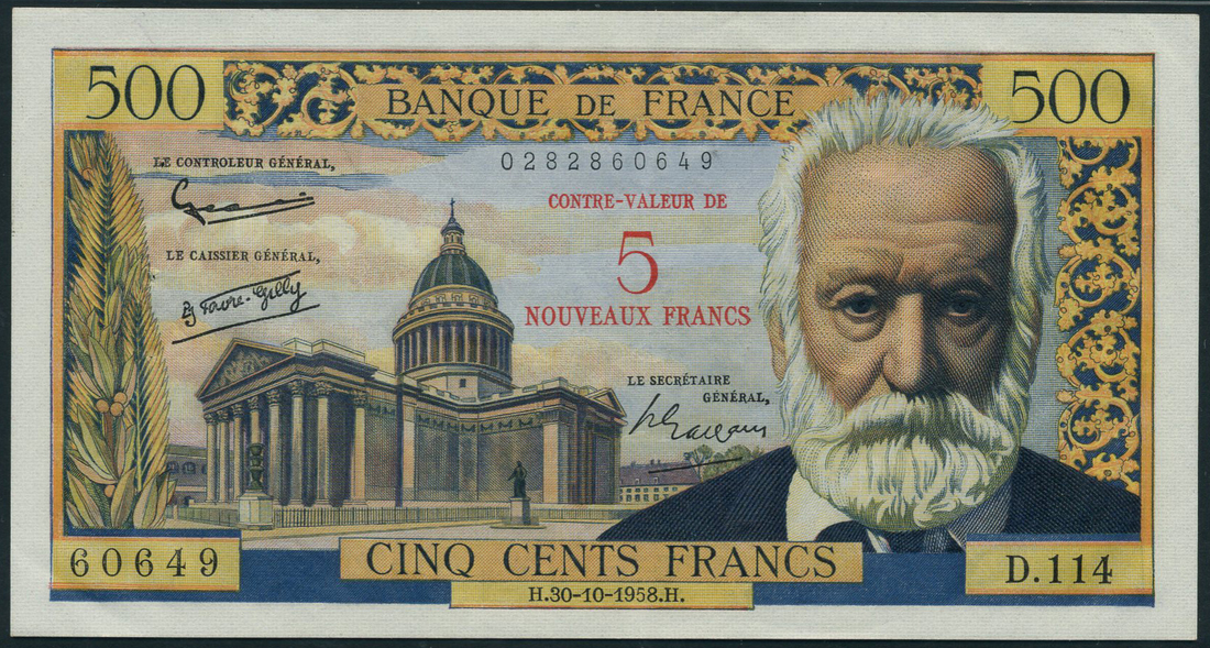 (x) Banque de France, 500 francs, ND (1958), serial number D.114 60649, blue and multicolour, Victor Hugo at right and building at centre left, reverse, Pantheon in Paris at centre right,