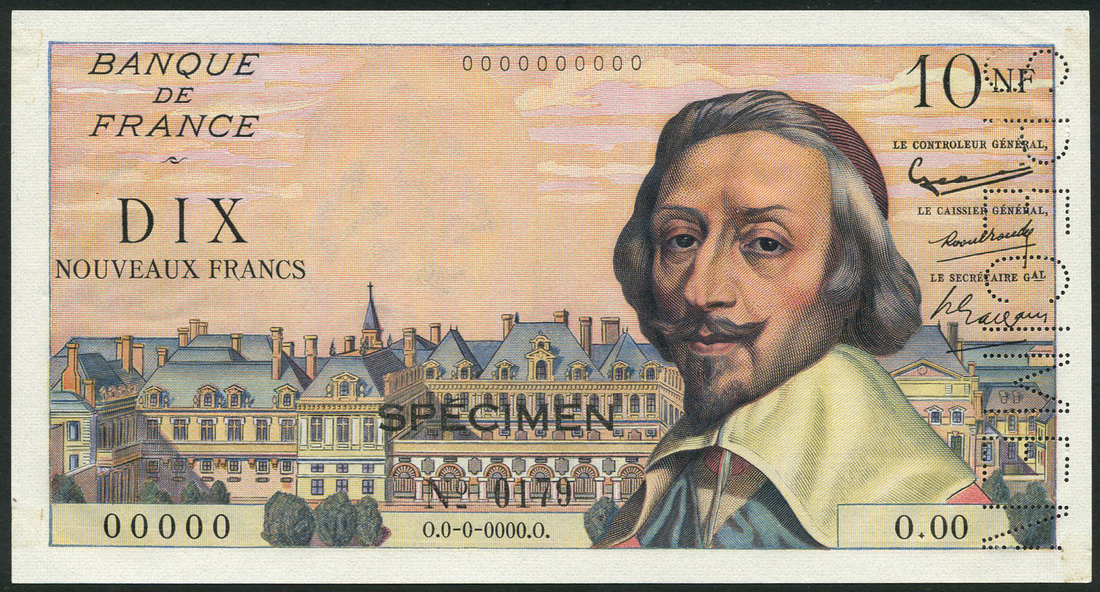 (x) Banque de France, specimen 10 new francs, 1959, zero serial number, multicolour, Cardinal Richelieu at right, perforated, black SPECIMEN overprint