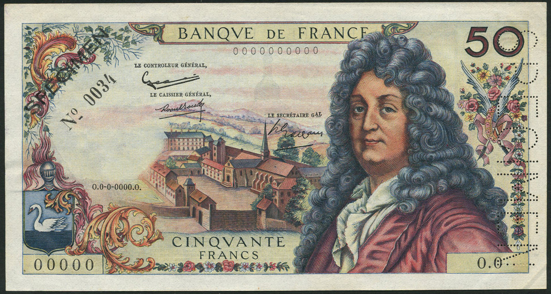 (x) Banque de France, specimen 50 new francs, 1959, zero serial number, multicolour, Henry VI at centre, Pont Neuf bridge in background and 50 francs, 1962, zero serial number, multicolour, Jean Racine at right, both have black SPECIMEN overprint and perforated