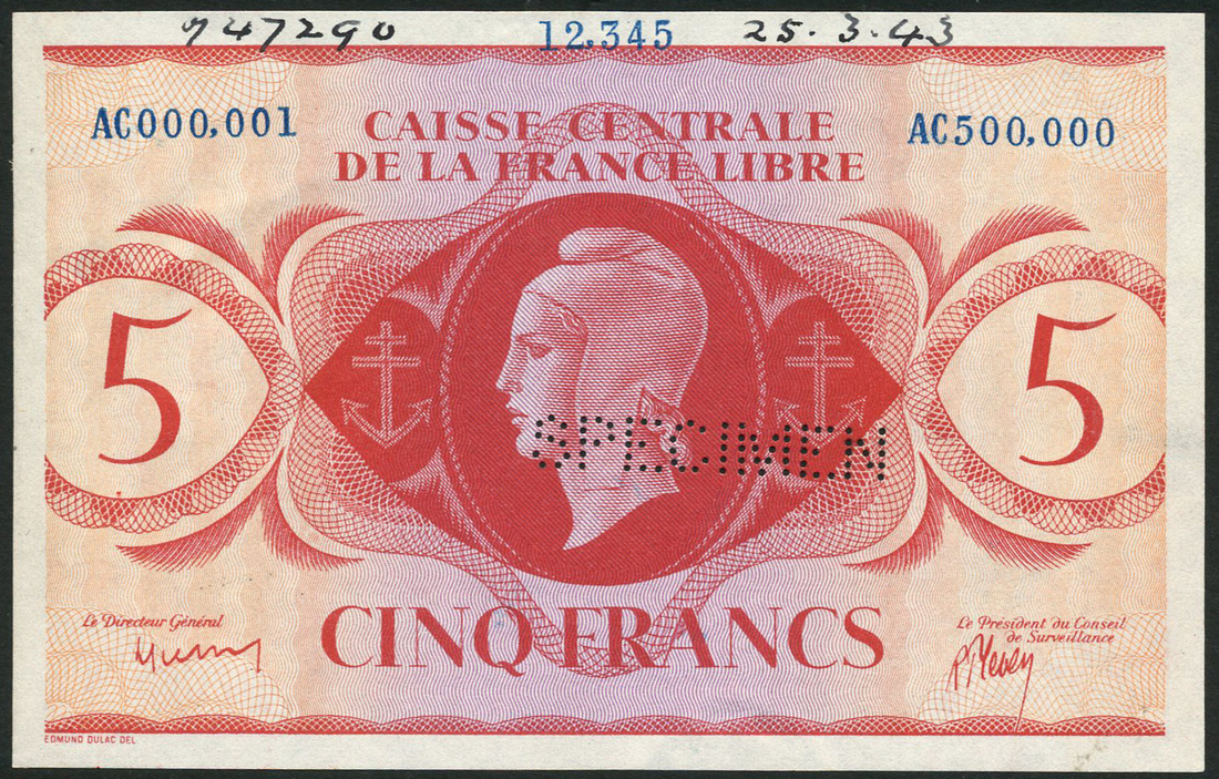 (†) Caisse Centrale de la France Libre, French Equatorial Africa, printer's archival specimen 5 Francs, Law of 1941, serial number run AC000,001 to AC500,000, signatures Andre Diethelm and Rene Pleven, red on orange and lilac underprint, portrait of Marianne at centre, value at left and right, reverse extract from Article 139 of the Penal Code, value at left and right, perforated SPECIMEN