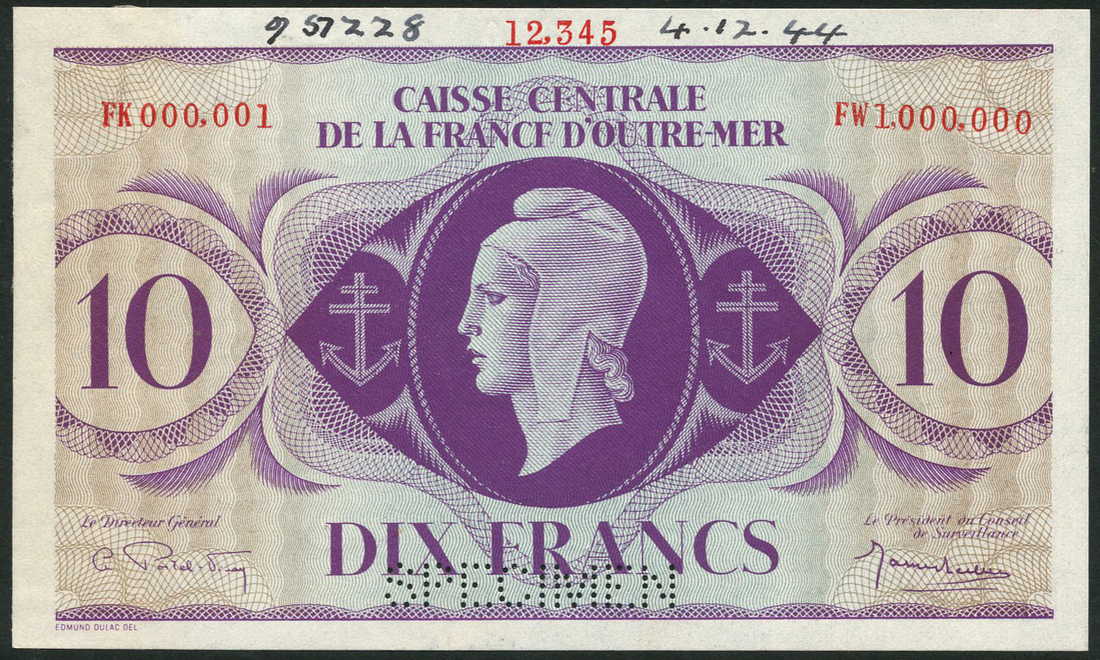 (†) Caisse Centrale de la France d'Outre-Mer, French Equatorial Africa, printer's archival specimen 10 Francs, Law of 1944, red serial number run FK000,001 to FW1,000,000, signatures Leclerc and Postel-Vinay, purple on pale blue-green and yellow underprint, portrait of Marianne at centre, value at left and right, reverse extract from Article 139 of the Penal Code, value at left and right, perforated SPECIMEN
