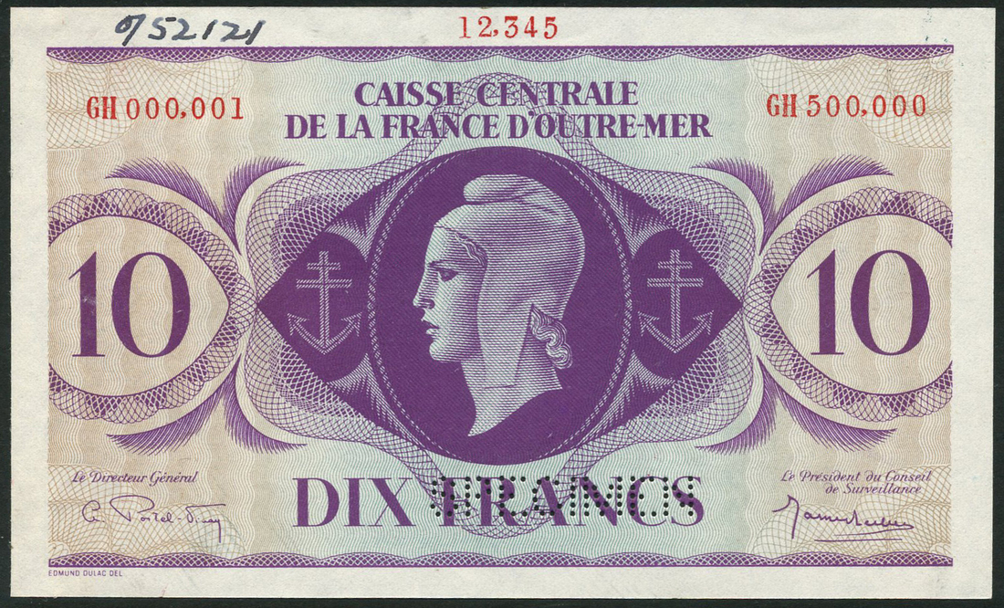 (†) Caisse Centrale de la France d'Outre-Mer, French Equatorial Africa, printer's archival specimen 10 Francs, Law of 1944, red serial number run GH000,001 to GH500,000, signatures Leclerc and Postel-Vinay, purple on pale blue-green and yellow underprint, portrait of Marianne at centre, value at left and right, reverse extract from Article 139 of the Penal Code, value at left and right, perforated SPECIMEN