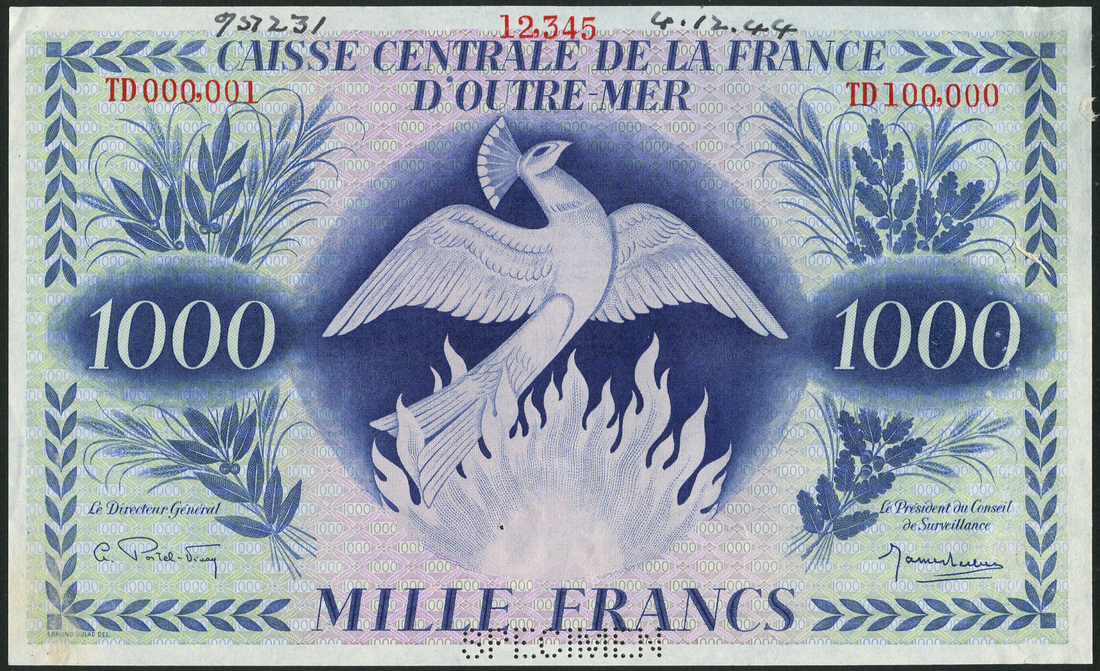 (†) Caisse Centrale de la France d'Outre-Mer, French Equatorial Africa, printer's archival specimen 1000 Francs, Law of 1944, serial number run TD 000,001 to TD 100,000, signatures Leclerc and Postel-Vinay, dark blue on pale blue-green and pink underprint, phoenix rising from the flames by Edmund Dulac at centre, value and foliage at left and right, reverse war-scarred landscape at left, peaceful landscape at right, perforated SPECIMEN