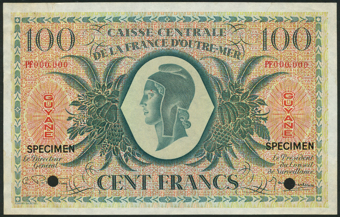 Caisse Centrale de la France d'Outre-Mer, French Guiana, specimen 100 francs, ND (1946), red serial number PF 000,000, green and pale red, head of Marianne at centre, exotic fruits and flowers to left and right, GUYANE in red at left and right, Postel-Vinay and Leclerc signatures, reverse green and pale orange, allegorical symbols of trade and commerce, black SPECIMEN overprints, two cancellation holes