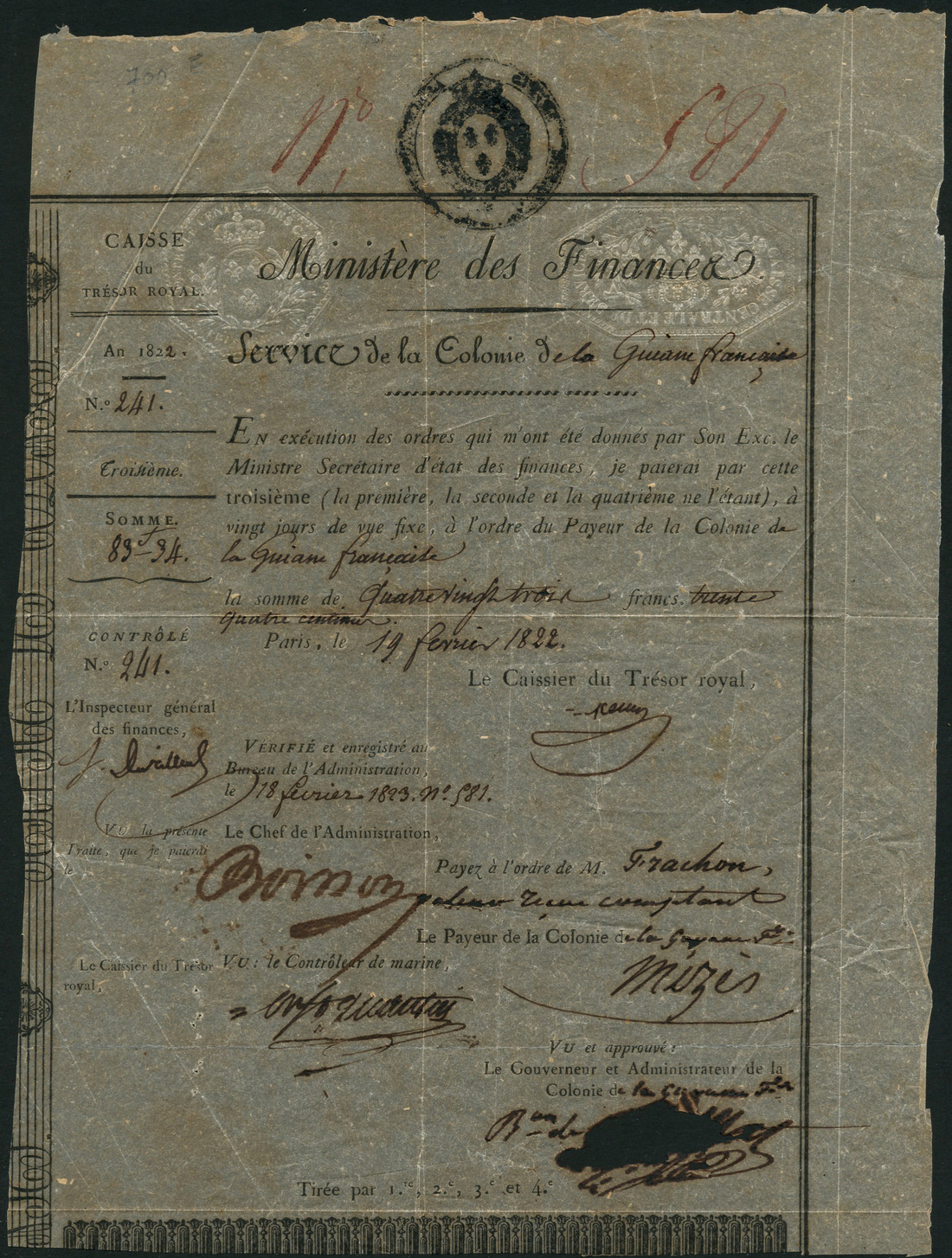 Ministry of Finance, French Guiana, a treasury warrant, "Troisieme" part, authorising payment of 83 francs, 34 centimes, for the Colony of Guiana, Paris, 1822, number 241, black printing on thin watermarked paper, impressed blind revenue stamps at top left and right, hand stamped arms at top centre, several signatures, these bills were issued with four copies, this being the third of this example, the rest being very unlikely to have survived