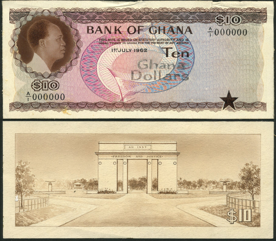 (†) Bank of Ghana, an obverse and reverse archival essay for a $1, green, $5, violet and $10, brown and an obverse essay for a $2, blue, all 1 July 1962, Kwame Nkrumah and star in field
