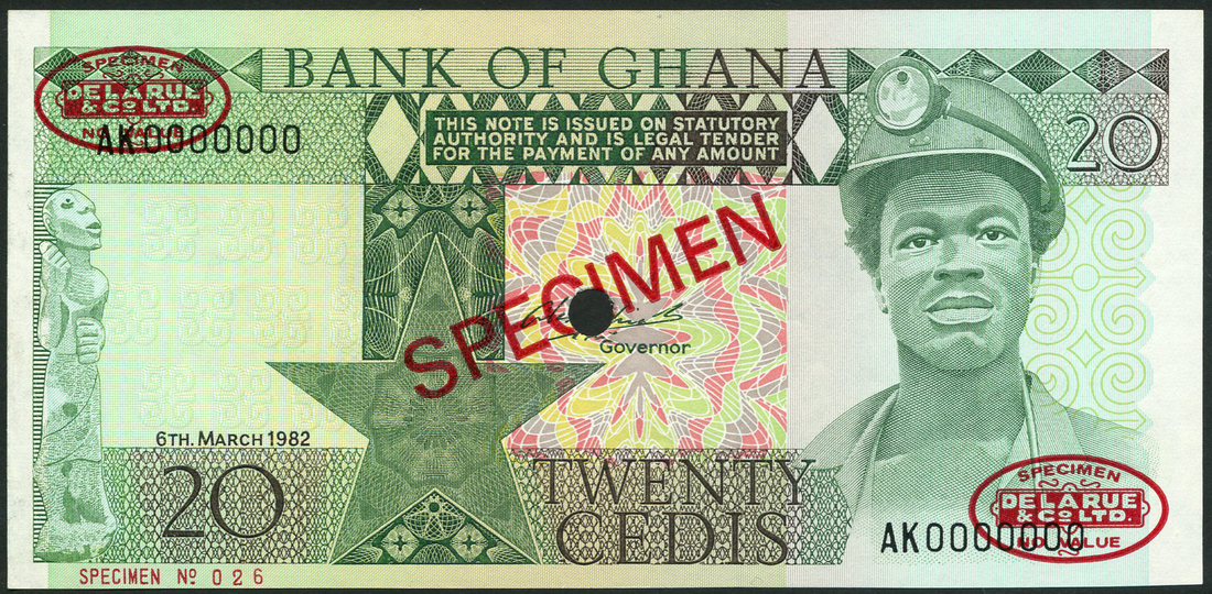 (†) Bank of Ghana, a partial set of the 6 March 1982 series comprising archival specimen 1, 2, 5, 10 and 20 cedis
