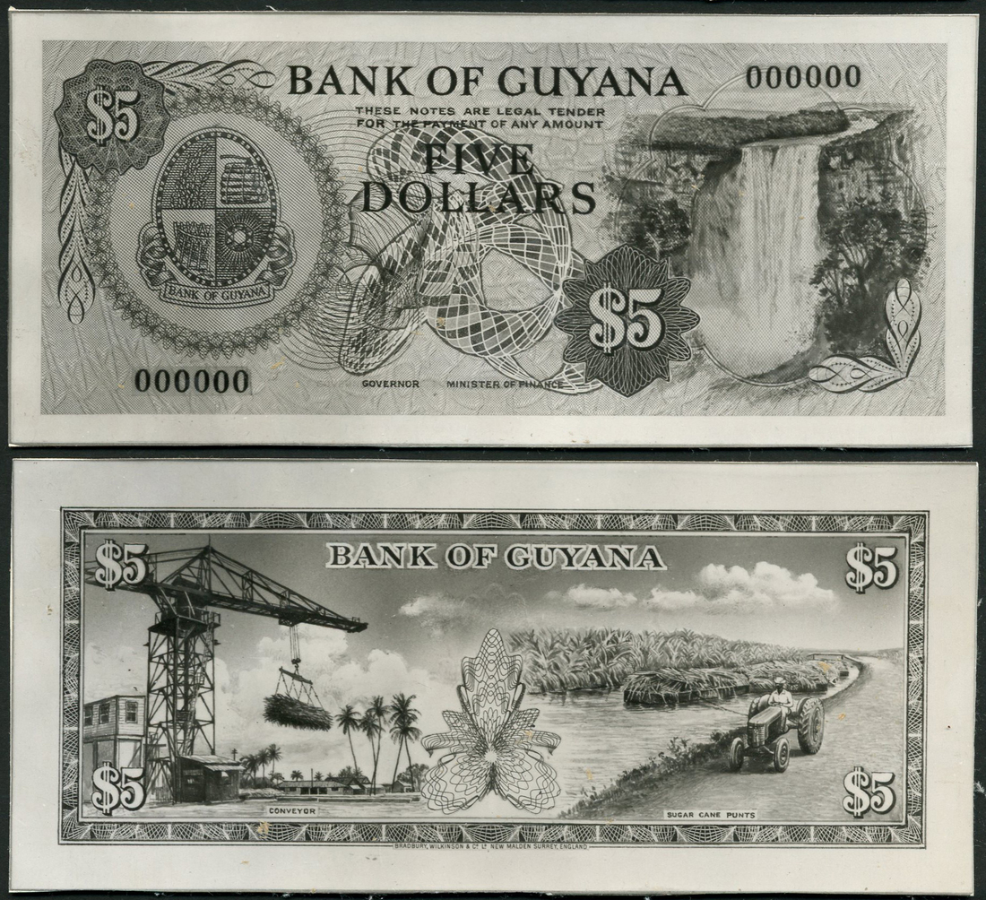 Bank of Guyana, a full set of archival photographs for the 1966 issue, comprising $1, $5, $10 and $20, all different from that issued, black and white, obverses with Kaieteur Waterfalls at right, arms at left, reverses showing similar scenes to those on the issued notes, but not the same designs