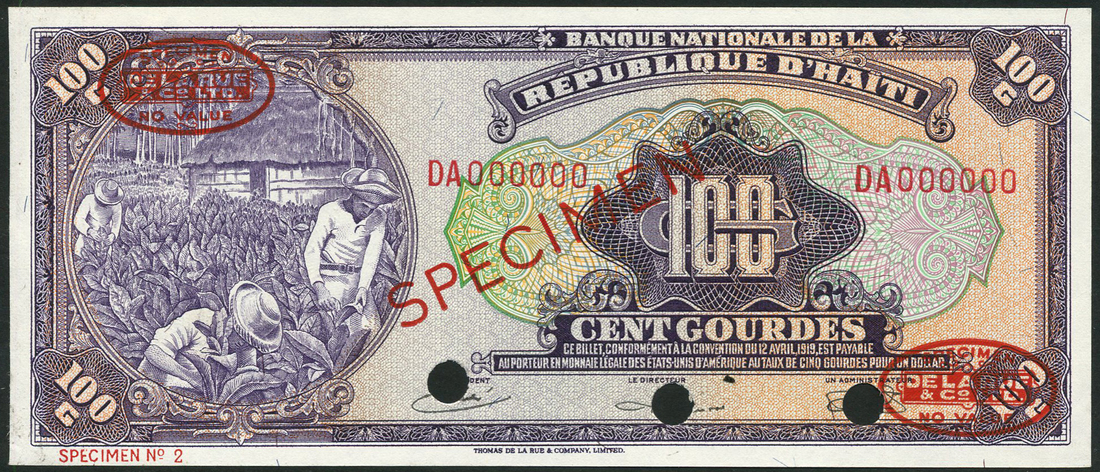 (†) Republic of Haiti, printers archival specimen 10 gourdes, green, 50 gourdes, olive and 100 gourdes, purple, all ND (ca 1967), all red serial number DA 000000