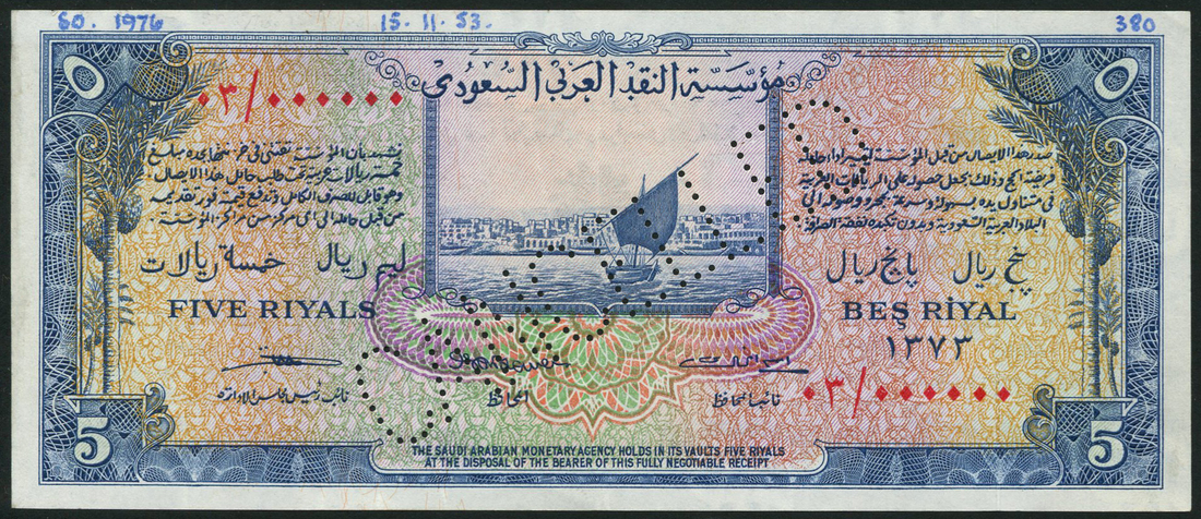 (†) Haj Pilgrim Receipt Issue, specimen 5 riyals, AH 1372 (1953), red zero serial numbers, blue and multicoloured, felucca in Jeddah harbour at centre, value at each corner, signatures of Najjeb Ibrahim Salha, George Blowers and Rasem Bey al-Khalidi low centre, reverse blue, arms at centre
