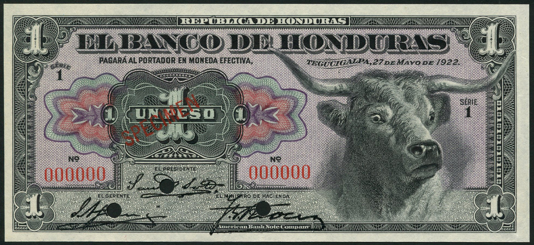 (x) El Banco de Honduras, specimen 1 peso, 27 May 1922, black and multicoloured, bull's head at right