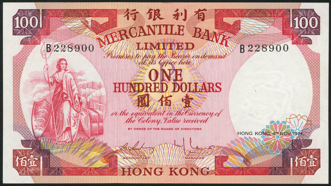 Mercantile Bank Limited, $100, 4 November 1974, serial number B228900, red on multicolour underprint, female allegory of trade and commerce at left, value at centre and each corner, reverse with view of Hong Kong at centre